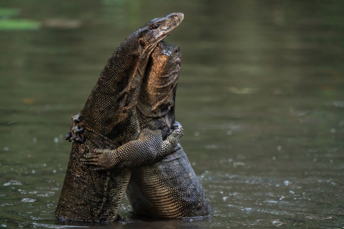 In the wetlands of Singapore, two monitor